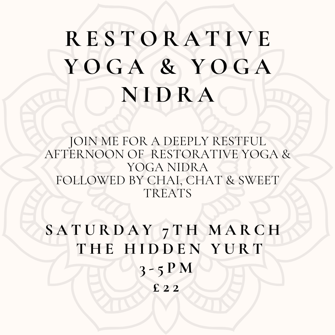 Back to All Events Restorative Yoga & Yoga Nidra Saturday 7 March 2026 15:00 17:00 The Hidden Yurt Penwith Pitch & Putt Chenhalls Road, St. Erth Hayle (map) Google Calendar ICS Book Now